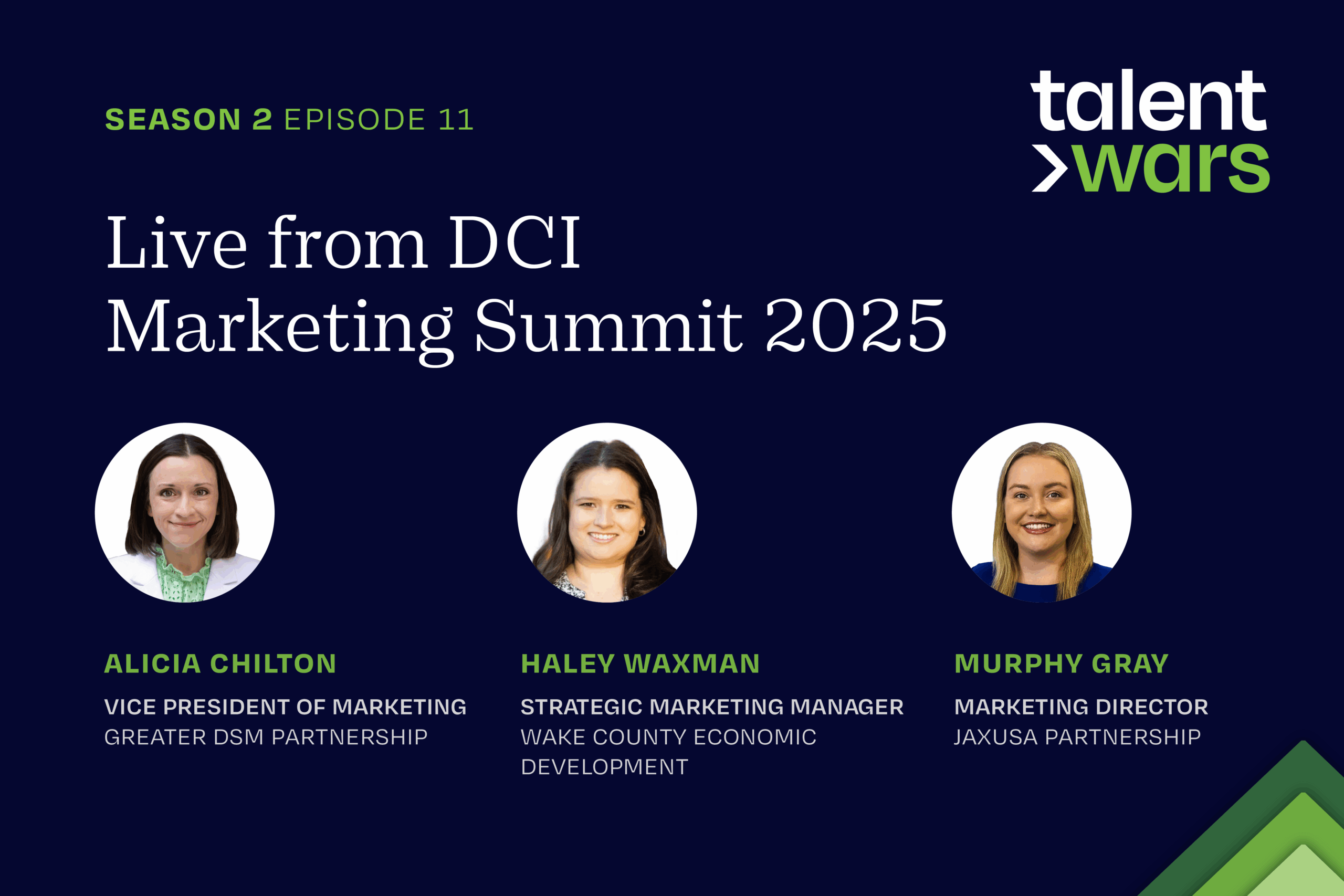 Talent Wars made it to the 2025 DCI Marketing Summit in New York, and we have a special episode featuring some of the marketing professionals at the event. Host Patience Fairbrother is joined by three leaders shaping talent initiatives in different regions: Alicia Chilton, vice president of marketing at Greater Des Moines Partnership, Haley Waxman, strategic marketing manager at Wake County Economic Development and Murphy Gray, marketing director for JAXUSA Partnership.